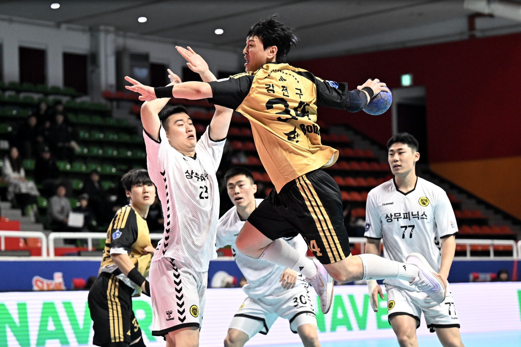 후반 초반에 두산이 김민규와 강전구의 연속 골로 19-10까지 달아났지만, 상무 피닉스 변서준이 연속 골을 넣으면서 3골을 따라붙으며 20-15로 격차를 좁혔다.